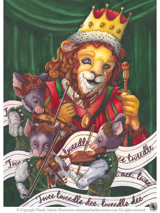 When I began the sketches for this piece, King Cole was human and so were his fiddlers. But, the longer I looked at it, the less happy I was with the ordinariness of it. So, Old King Cole morphed into a lion and his fiddles became 3 musically inclined mice.