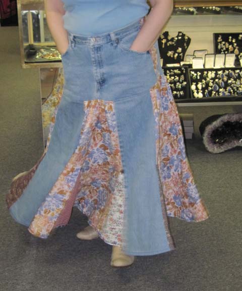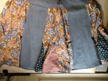 This originally started out as a pair of jeans, an old favorite skirt and 4 fat quarters I never used. The skirt has been hanging in the closet of a dress dummy that was my size back in 1981 before kids, husband and age. The hem had come down and I was going to fix it “one day.” And never got to it, and now the skirt no longer fit.